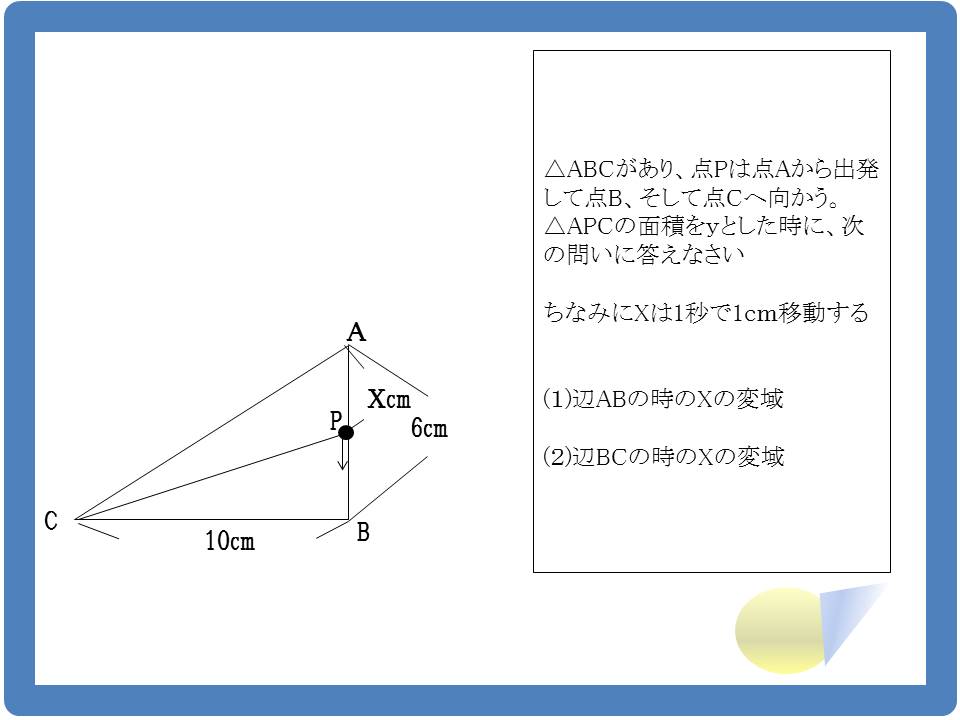 最初は、しっかりとⅩの変域を理解しておきましょう。点PはBまで移動すると点Cに向かって移動をします。そのため(1)の辺ABの時の変域と(2)の時の変域の2つを考えるようにしましょう。今回は問題にしていますが入試問題では、わざわざ変域を求めずに設問がつくられる場合もあるので今のうちにしっかりと学習しておきましょう。
